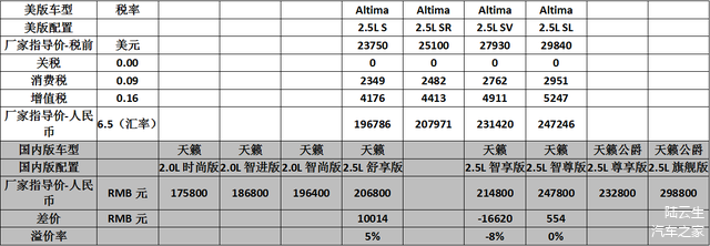 Altima与天籁价格对比见下表(平均溢价率-1.5%):