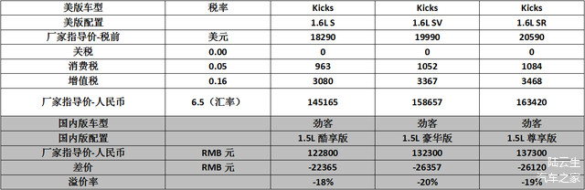 Kicks和劲客的价格对比如下表(平均溢价率-19%):
