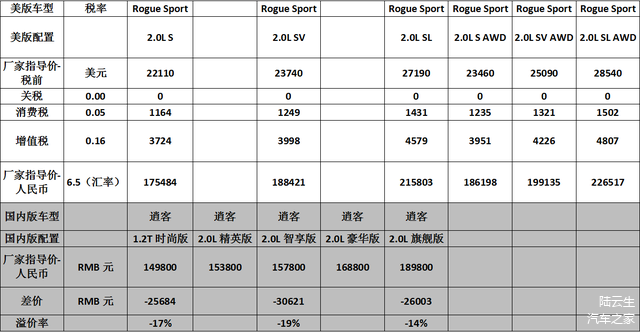 Rogue Sport和逍客的价格对比见下表(平均溢价率-16.7%):