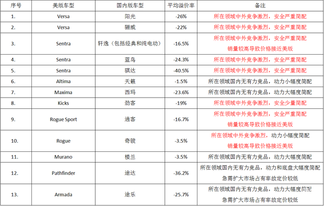 1. 中国品牌对外国品牌竞争激烈的紧凑型轿车领域,日产投放的车型会多于美版,定价会低于美版。紧凑车领域,美版Versa对标国内版阳光和骊威(车型对比1:2),美版Sentra对标国内轩逸、轩逸经典、蓝鸟、骐达(1:4)。价格方面,阳光和骊威的平均价格比Versa低24%左右,轩逸、蓝鸟、骐达的价格比Sentra低30%左右。日产为什么要在紧凑车领域花大力气搞外形研发,而且一定要通过简配等手段把国内版紧凑车的价格压下来呢?因为中国品牌的崛起起到了重要的作用,目前中国品牌的产品(尤其是上汽、吉利、广汽、长安等企业)已经对合资产品构成了强烈的竞争,为了保持市场占有率,日产不得不采用“多生孩子好打架”(多种车型)、“低价促销”(简配低价)等方法。在国内消费者还在迷信“合资就是好”的时候,日产已经用实际行动告诉大家,中国品牌的崛起已经对合资企业构成了影响。