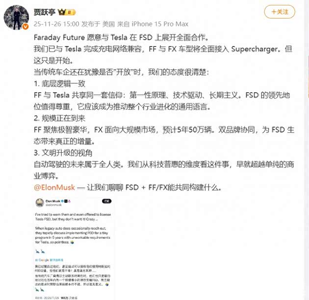 FF与特斯拉达成超级充电合作后,又将达成新合作?11月26日,FF创始人、联席CEO贾跃亭在社交渠道上表示,FF希望与特斯拉在全自动驾驶(FSD)系统上展开全面合作,并直接喊话埃隆·马斯克:“让我们聊聊FSD+FF/FX能共同构建什么。”