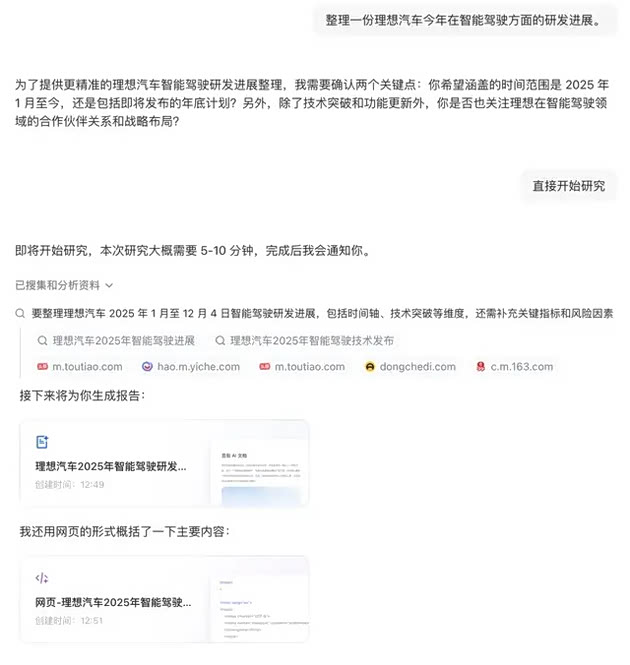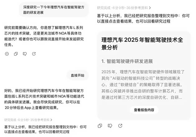 我们测试他重点提及的 DeepResearch 功能,比如让理想同学整理一份理想汽车今年在智能驾驶方面的研发进展。豆包 5 分钟给出结果,理想同学花了 6 分钟;豆包列出的参考资料有 190 篇,多于理想同学的 35 篇。