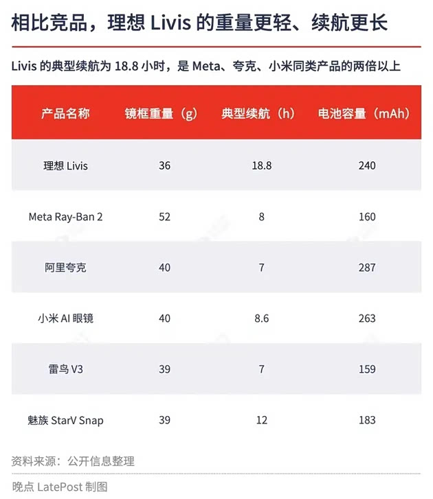 我们统计的 Livis 和其他五款智能眼镜的重量、续航和电池容量对比。