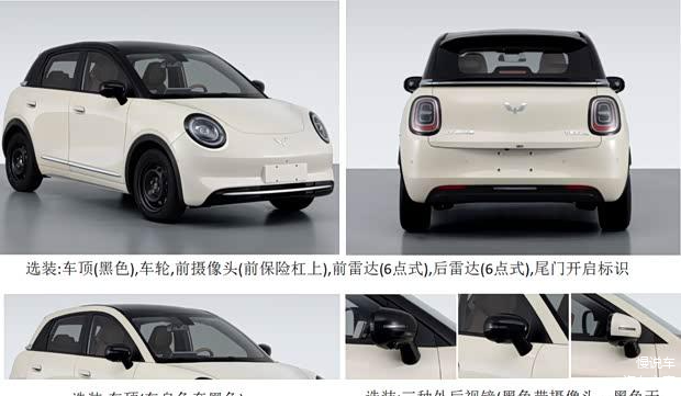 车尾部分,方圆造型的灯组与车头形成呼应。尺寸方面,新车长宽高分别为4050/1750/1580毫米,轴距达到2560毫米。在配置选装方面,该车提供了前摄像头、前后雷达、尾门开启标识、多种轮圈样式以及两种车顶颜色可选。外后视镜也有三种版本,包括黑色带摄像头、黑色无摄像头以及车身色套黑色带摄像头。