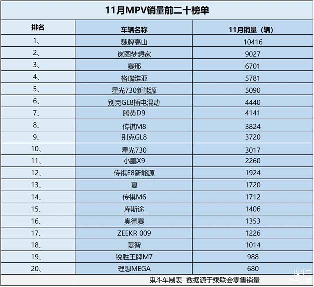 日前,乘联会发布11月车市零售销量数据,鬼哥整理出MPV市场销量排名前二十榜单,排名结果让很多网友们很意外,榜单上仅有一个款车型销量过万,而且,冠军易主,多款车型上演“后来者居上”的戏码。接下来,我们看看具体销量排名情况。
