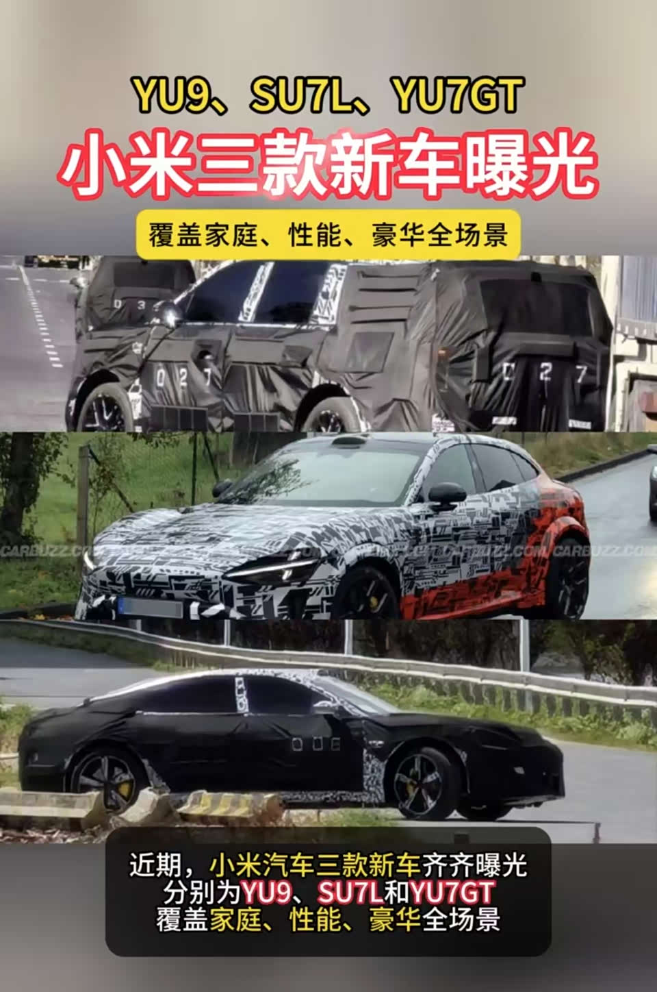 米雷德YU9是增程大七座旗舰,车长超5.2米+大约400km纯电续航,小米做这台车就是奔着全家人一起长途续航去的;YU7 GT是性能SUV,纽北刷圈狠货,听说有碳陶瓷刹车+宽体套件;最后这个焕新版SU7看谍照车身更修长了,小米的家族产品线正在快速完善,家用、性能全覆盖,毕竟销量在那摆着,反正期待一下米雷德YU9,网友的图片没一个丑的……