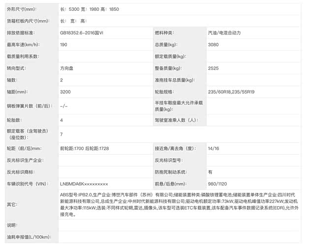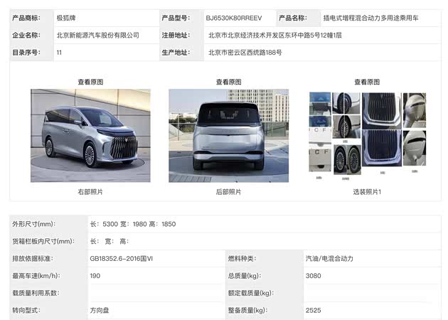 动力系统方面,极狐MPV采用增程系统,增程器为1.5T发动机,输出功率118kW,而电机功率为227kW,但是没有申报双电机版本。