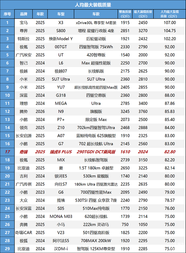 我们这辆车的整备质量为1610千克,最大满载质量为2024千克,计算得出这辆瑞虎8 PLUS 290TGDI DCT乘风版的人均最大装载质量为82.8千克,超出标准8公斤。