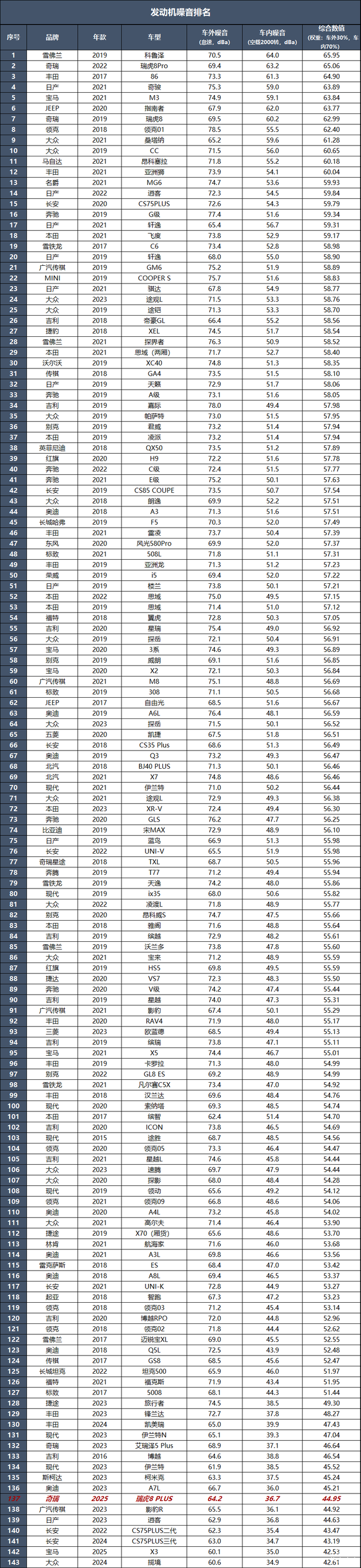 测试方法:发动机完全热机,水温正常,关闭空调,正常怠速下进行测试;打开发动机盖、取下引擎罩,在距离发动机机体上方20厘米处,进行噪音采集,取平均值,为车外发动机噪音数值(dBa);在车内,将车窗关闭,发动机空载运转2000转/分,将噪音仪置于方向盘正上方,取平均值,为车内发动机噪音(dBa)数值。并且以车内30%,车外70%的权重进行综合计算。