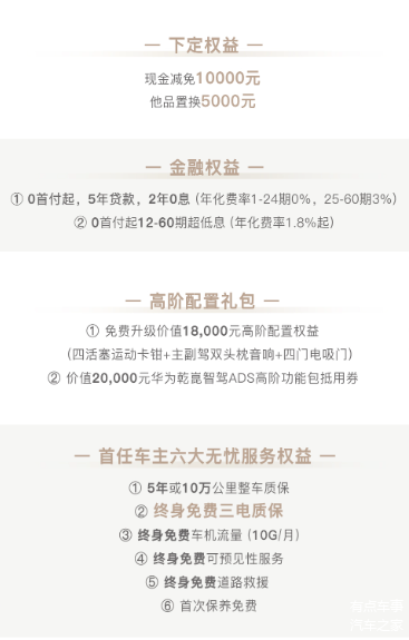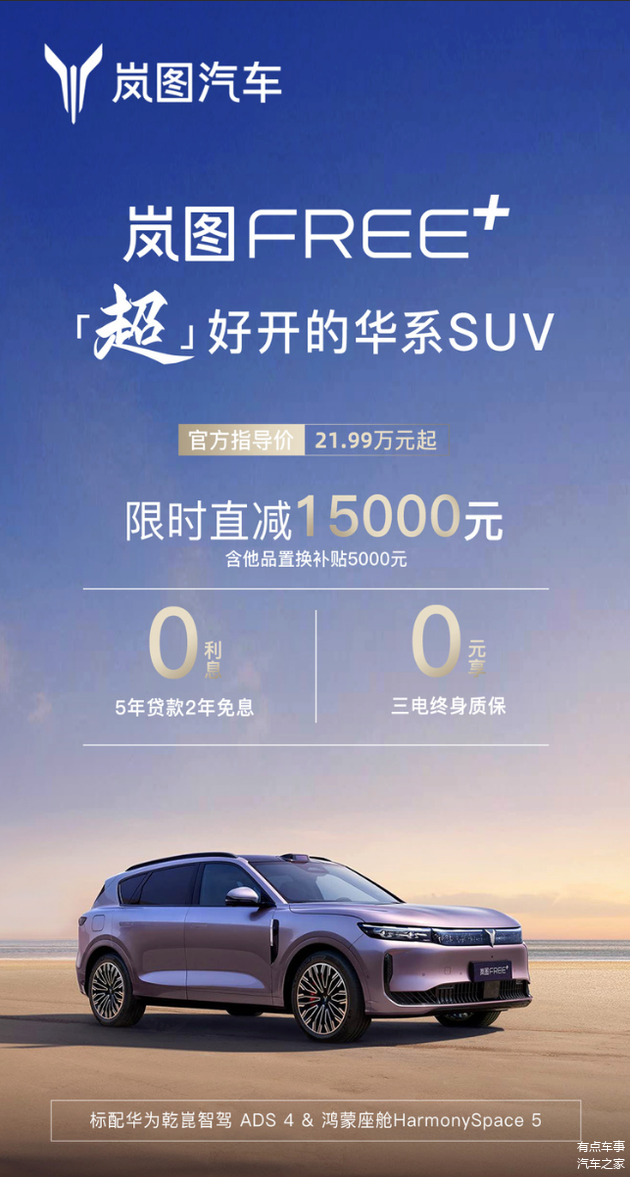目前岚图FREE+的市场政策总结起来就是两个字——全面,销售端涵盖现金减免、配置升级、金融三个板块,售后端则加强了保障的条款,解决了用户用车的顾虑。
