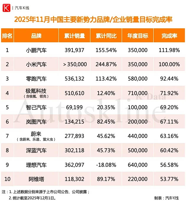 截至今年前11个月,阿维塔销量为11.83万辆,目标完成率仅为不到54%,位列主要新势力品牌完成率倒数第一。