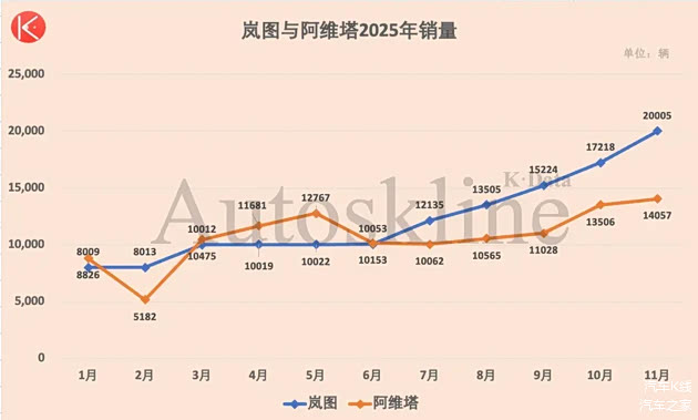 从今年双方销量数据来看,自7月开始,岚图汽车完成对阿维塔的反超,之后便“一发不可收”,保持环比超10%的增速一路高歌;在刚刚过去的11月,岚图成功突破2万辆大关。