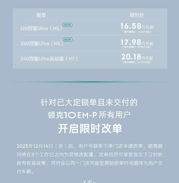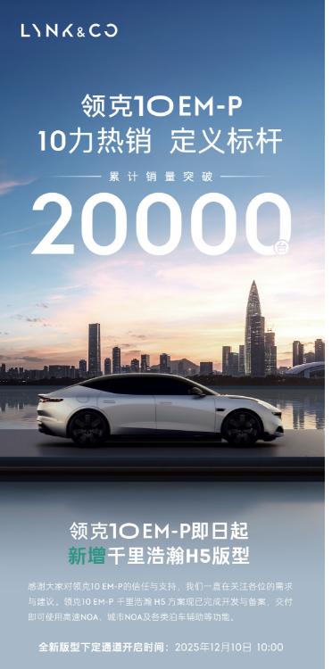 上市3个月,领克10EM-P累计销量突破2万台,也连续3个月中大型混动轿车销量前三。响应大家的声音,今天还上线了千里浩瀚H5版型,比H7版型便宜6000元,大定锁单且未交付的用户可以限时改单,对于不喜欢用智能辅助驾驶的家庭,是一次比较灵活的选择。