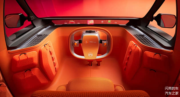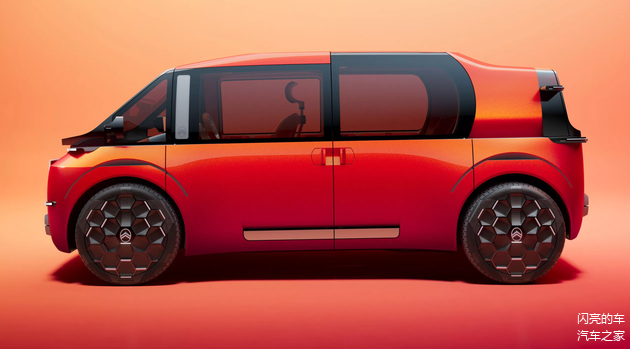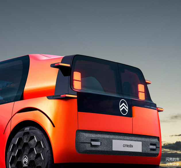 概念车采用了较为方正的整体设计,并且结合了MPV车型的轮廓以及模块化的座舱设计,整车以非常亮眼的橙色为主色调,前脸采用了非常简洁的设计,前挡风玻璃呈独特的弧形并且与驾驶舱上方的一小块玻璃车顶相连,上下两块堆叠式分体大灯、两侧上下各一条L型转向灯以及中间可发光的雪铁龙徽标共同组成了前脸的照明系统,格栅采用了完全封闭式设计,下方为集成了车牌以及进气口的前保险杠,从官图来看,前脸造型非常简约但颇具科技感。