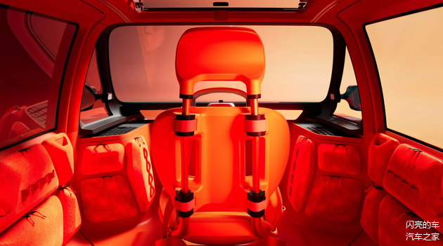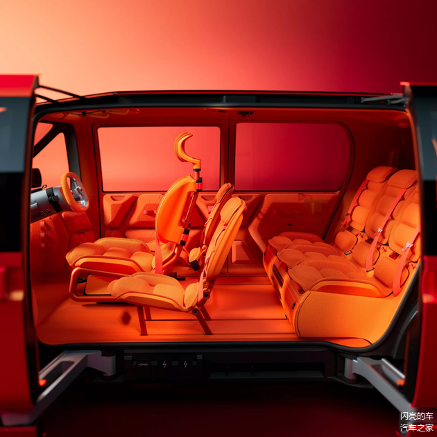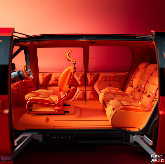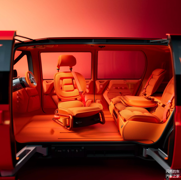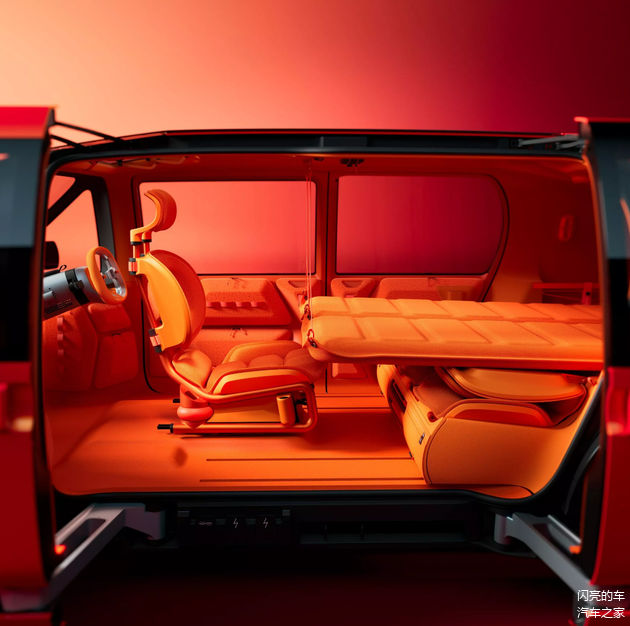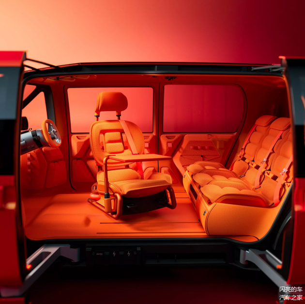因为只有两排座椅,所以整个空间十分宽敞,第二排座椅设计为三个座,加上驾驶员一共是四人座,如果想要六人座,那么在驾驶员座椅的两侧分别有一个支持可拆卸的座椅设计,不过,两侧的座椅位置相比驾驶员座椅要稍微靠后,而且驾驶员座椅还支持180度旋转,从而可以直接与后排人员进行更方面的交流。后排座椅区域还配备了两张充气床垫,在需要时可以变为大床便于休息,平时不用的时候,可以放置在后备箱中。