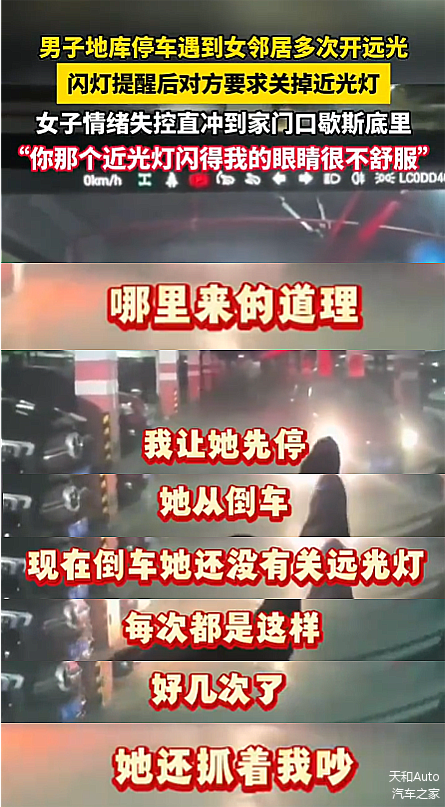 12月8日,在黑龙江一小区的地库里发生一起因错误使用汽车灯光导致的冲突事件。当日,一名男子驾驶汽车进入地库发现前方一辆车开着远光灯,刺眼的灯光影响其驾驶视线;随后其通过闪灯的方式提醒对方车辆司机关闭远光灯,但是对向车辆的女司机不仅没有切换灯光,还示意该男子关闭近光灯。