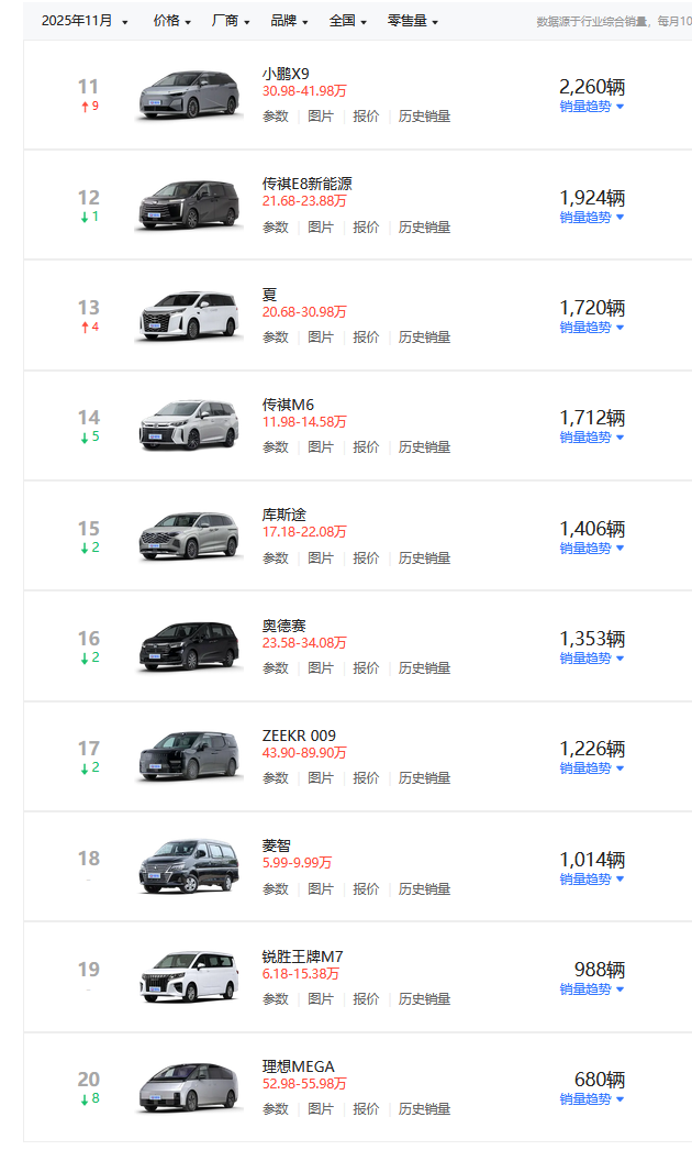 第11名小鹏X9,本来最近一年的月销量都徘徊在1500台左右(6月份的小高峰是因为25款开启交付),毕竟纯电MPV都不太好卖。不过随着11月20日X9增程版上市,提振效果立竿见影的,环比增幅170%之多!