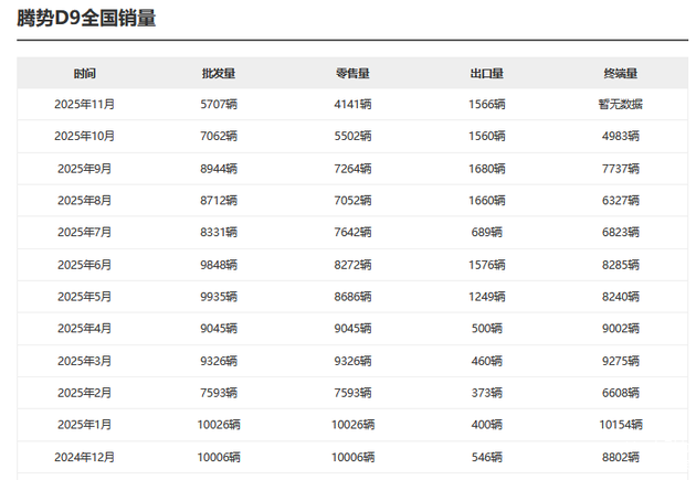 其实直到9月份,D9的零售量还保持在7000+的高位,但一直拿D9当靶子的全新高山、26款梦想家刚好在秋季同时发力,所以10月掉1700台、11月又掉1400台并不意外。