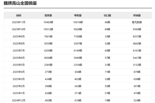 第一名由魏牌高山蝉联,10月和11月批发量都破万了。终端量(上险量)还没有数据,但从历史数据看,偏差在10%以内,水分不大。