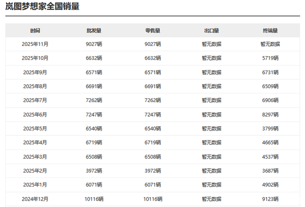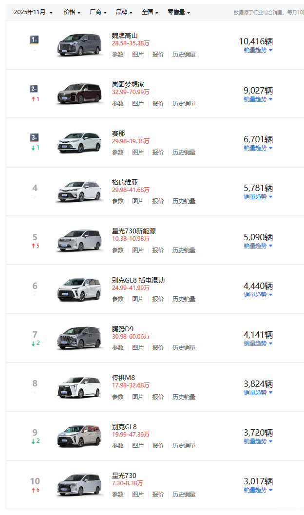 第二名岚图梦想家批发量环比猛增36%,9000台出头,直接把丰田赛那挤到第三。前10个月基本稳定在6000-7000台,11月应该是大幅置换补贴政策起到了拉动作用。