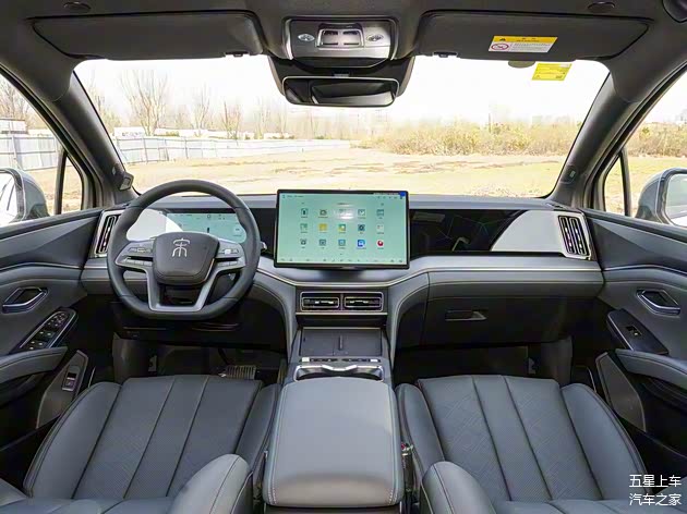 坐进车内,宋L DM-i的内饰风格可以用“简约不简单”来形容。中控台采用对称式布局,保留了空调调节旋钮等实体按键,操作起来比全触控更顺手。材质上,软性搪塑、钢琴烤漆面板和仿碳纤维饰板的搭配,让内饰层次感丰富,没有廉价感。