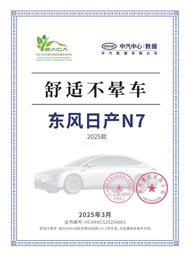 最令人印象深刻的是其全域智能防晕车系统。通过整合底盘、动力、座舱、辅助驾驶四个领域的13项防晕对策,东风日产N7有效减少了电动车常见的眩晕感。获得中汽中心“舒适不晕车”认证,是对这项技术的最佳肯定。在实际道路驾驶中,车辆的动力输出平顺线性,制动过程稳定不点头,这些细节优化对于提升全家人的乘坐舒适度至关重要。