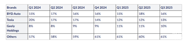 Counterpoint公布了2025年第三季度全球电动汽车市场份额数据,比亚迪、特斯拉以及吉利成为市场前三的品牌。