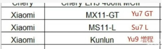 事实上,今年早前几个月,网上流传着一张小米新车计划的图表。上面显示,小米正在开发三款新车。这三款新车的代号,分别为MX11-GT、MS11-L、Kunlun。