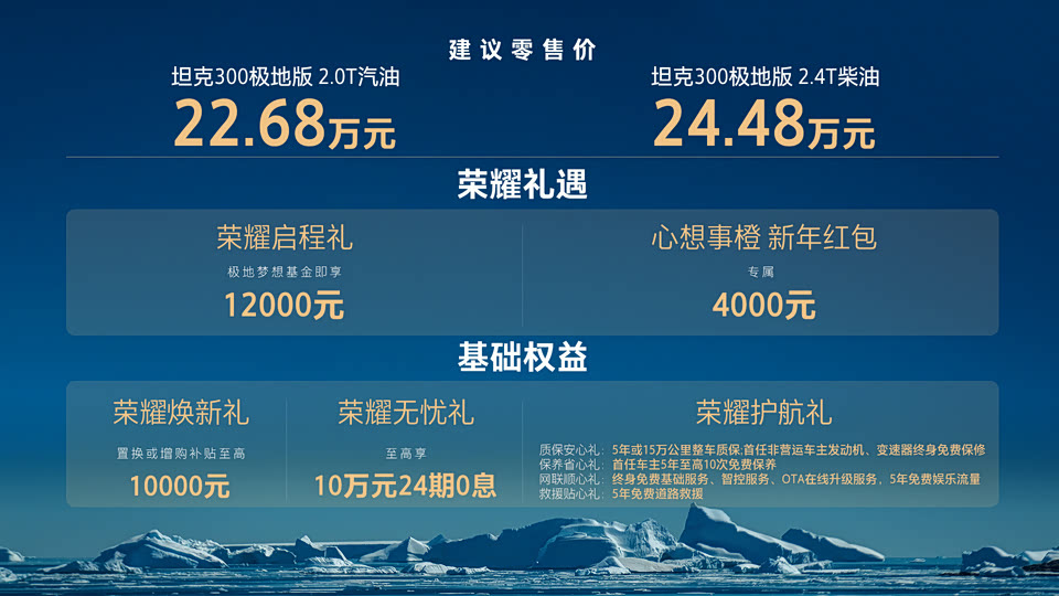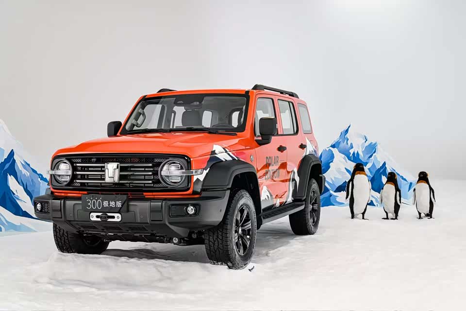 12月11日,坦克300极地版正式上市,售价为22.68万元-24.48万元。新车在普通版的基础上采用专属拉花,并搭载多项升级装备,进一步兼顾冰雪场景。该车限定300辆销售,本月下旬正式开启交付。外观层面,坦克300极地版会以“极地橙”为底色,增加“极地荣耀徽章”以及“极地锋芒”拉花,整车的辨识度还是很高的。值得一提的是,之所以用橙色为主色调,是因为该颜色是国际救援的安全色。在车内,极地版的座椅头枕上烫印了南极版图与长城站的经纬坐标。配置方面,坦克300极地版有几项专属升级。该车配备支持远程控制开启的前风挡加热功能、支持自动开启的雨刮喷嘴加热功能、原厂AT全地形轮胎(265/65 R17)、9500磅无线遥控绞盘、2.5吨牵引资质。动力系统部分,坦克300极地版会有柴油版和汽油版。柴油版搭载2.4T柴油发动机,最大功率为137kW(186马力),峰值扭矩为490N·m;汽油版搭载2.0T汽油发动机,最大功率为167kW(227马力),峰值扭矩为387N·m;传动系统部分,该车使用9速手自一体变速箱,匹配电控分时四驱(带中央锁止功能)。