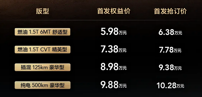 提供1.5T+6MT/CVT,1.5L插混以及纯电三种动力形式。