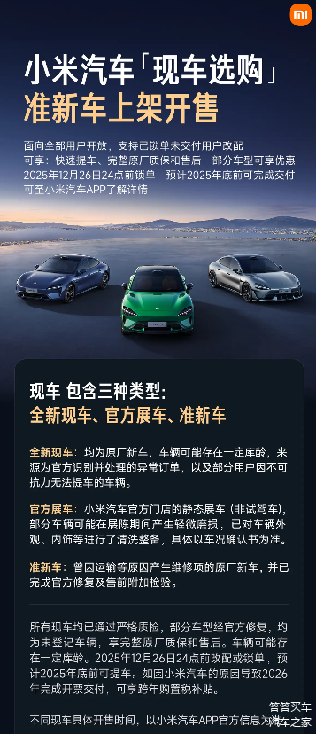 据小米官方介绍,现车选购的车辆包含全新现车、官方展车、准新车三种类型,其中全新现车的来源是小米官方识别并处理的异常订单,部分用户因不可抗力无法提车导致了订单异常。官方展车是在小米汽车官方门店中进行静态展示的车辆(非试驾车),官方展车的外观、内饰已进行了清洗整备。准新车的来源是产生维修项的原厂新车(运输等原因),这些车辆已经完成官方修复以及售前附加检验。