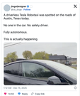 马斯克之前承诺,完全无人驾驶的Robotaxi会在年底前上路,这不就有网友拍到了。有人在奥斯汀拍到了车内完全无人的Robotaxi在测试,马斯克也在评论中证实,“测试在进行中,车内没有人。” 从网友拍到的视频来看,至少有两台无人车在测试,具体有多少台车上路目前不确定。 看来2026年会是无人驾驶大爆发的一年。