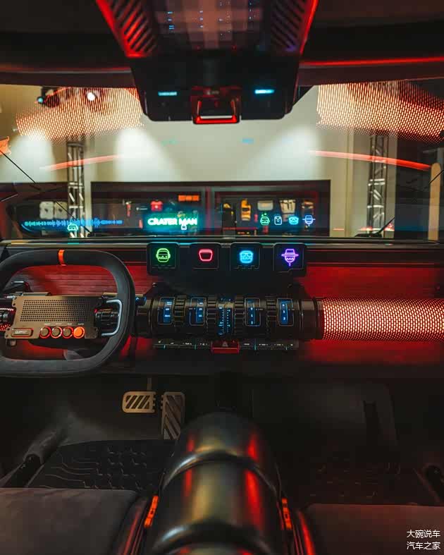 车内采用了贯通式的中控台造型,矩形的方向盘造型极具科技感,采用了四颗显示屏的设计,并且下方带有滚轮的造型,造型还是非常科幻。