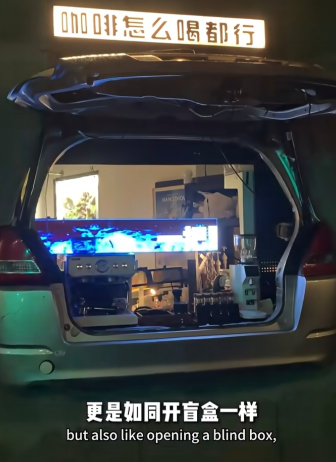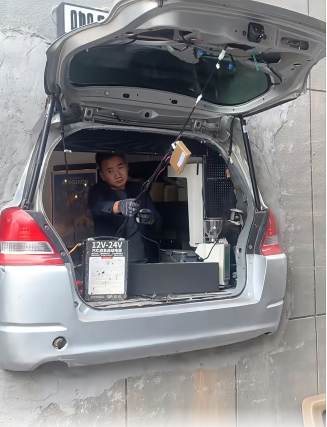 丰田一位车主将车糊在了墙上,开起了咖啡店。