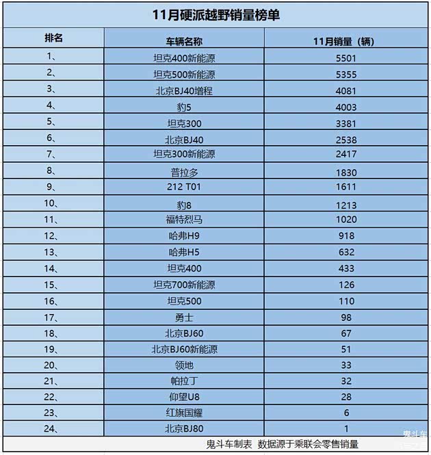 尽管如此,但这一细分市场的整体销量并不给力,日前,乘联会发布11月车市零售销量数据,鬼哥整理出11月硬派越野销量榜单,结果,榜单上,没有一款车型销量达到万辆,跟市场上的热闹场景形成反差。接下来,看看具体的产品排名与销量表现。