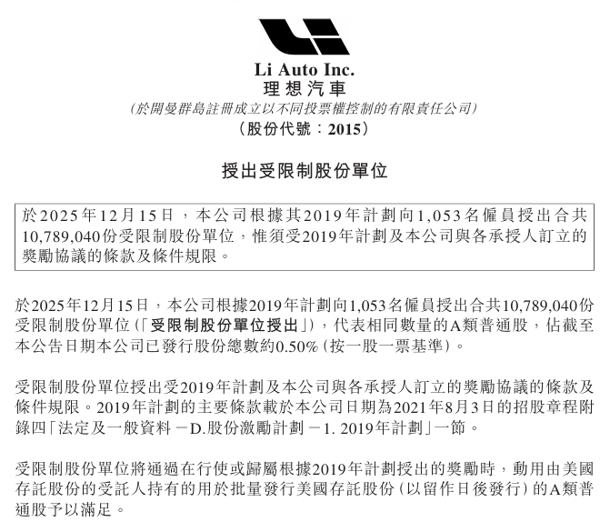 【#理想汽车# :根据2019年计划向1,053名雇员授出合共10,789,040份受限制股份单位】 理想汽车在港交所公告,于2025年12月15日,本公司根据2019年计划向1,053名雇员授出合共10,789,040份受限制股份单位,代表相同数量的A类普通股,占截至本公告日期本公司已发行股份总数约0.50%(按一股一票基准)。