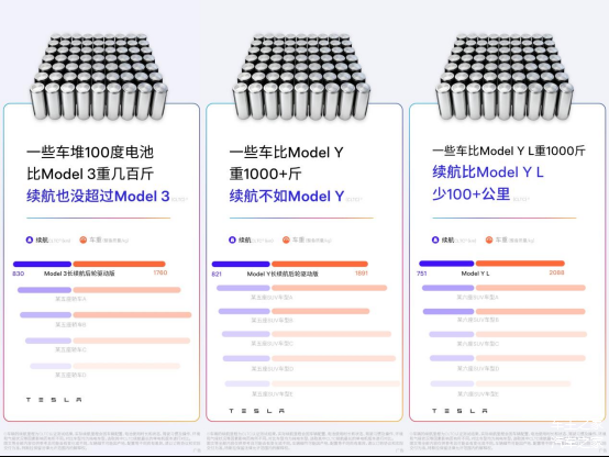 不过后面车型对比的图就有点难绷了,按照特斯拉的描述,一些车堆100度电池比Model 3重几百斤续航比不过Model 3,一些车比Model Y重1000多斤续航比不过Model Y,一些车比Model Y L重1000斤,乍一看挺有道理的,但是仔细想想就不对劲了。