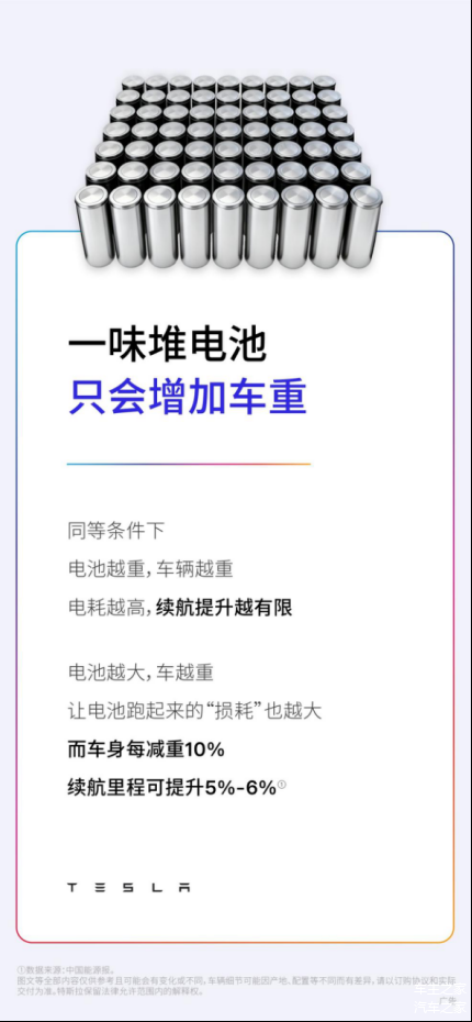 首先特斯拉对轻量化意义的诠释还是没问题的,轻量化有助于节能,提升操控表现,并且对轮胎的负担也更小。比起盲目堆大电池,更重要的是找到一种车重与续航的平衡点,最终实现用小一号的电池实现与大电池车型持平甚至更优秀的续航和能耗。