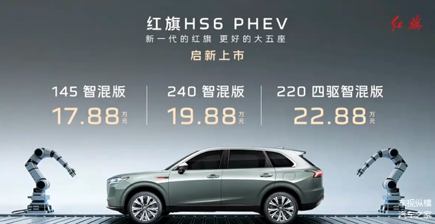 12月16日, 红旗HS6 PHEV完成正式上市。新车共推出3款配置车型,售价区间为17.88-22.88万元,定位中大型插混SUV,隶属于红旗“鸿鹄”混动平台。动力上搭载1.5T插电混动系统,纯电续航最高可达248km,综合续航里程为1650km。上市阶段,品牌为购车用户提供六项专属权益。