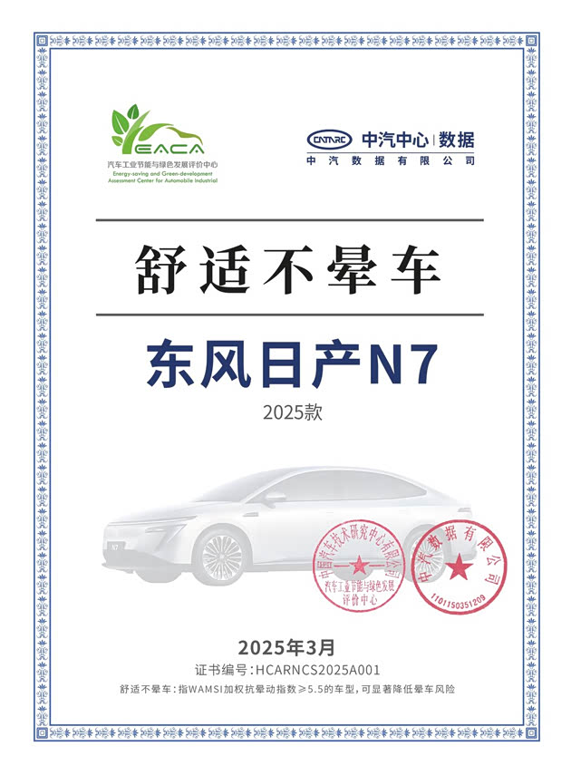电车的加速性强,不像油车那么线性,这非常影响行驶时的乘坐舒适性,很多老人小孩坐电车容易晕车就是这个原因。所以在提升行驶舒适性上,东风日产N7还用上了全域智能防晕车技术来降低乘客晕车的概率。