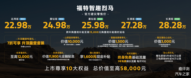 为秉承福特“以用户为中心”的承诺,同步推出“十大尊享权益”,全面覆盖购车、用车玩车全周期,即:7折享受价值12000元“升顶露营悦享礼”;价值10000元“山野厨房尊享礼”;价值1500元“智趣场景尊享礼”;价值3000元的“限定潮色心动礼”;至高15,000元的跨年购置税补贴保障;优享置换礼,置换补贴至高12,000元;优享金融礼,提供价值11900元金融贴息,多种灵活方案供客户选择;随心购置礼,赠送1,600元现金补贴,可用于购买充电桩和TF存储卡;无忧流量礼,终身免费基础流量,3年免费娱乐流量,每月10G;安心用车礼,