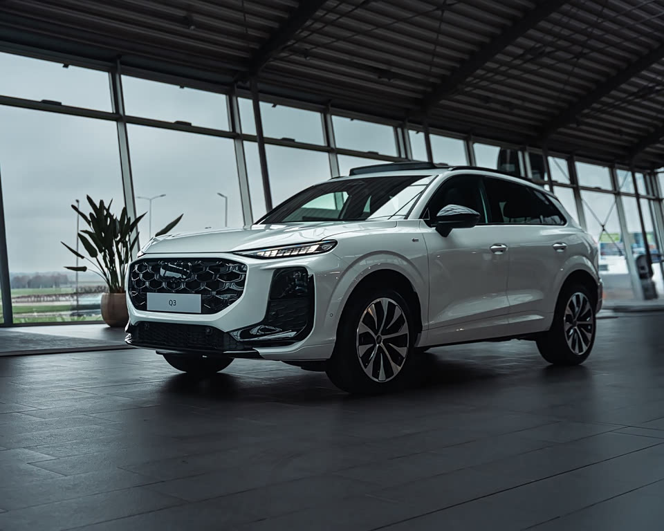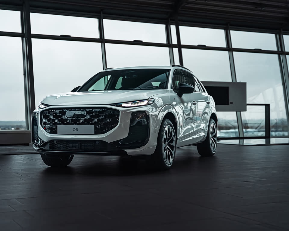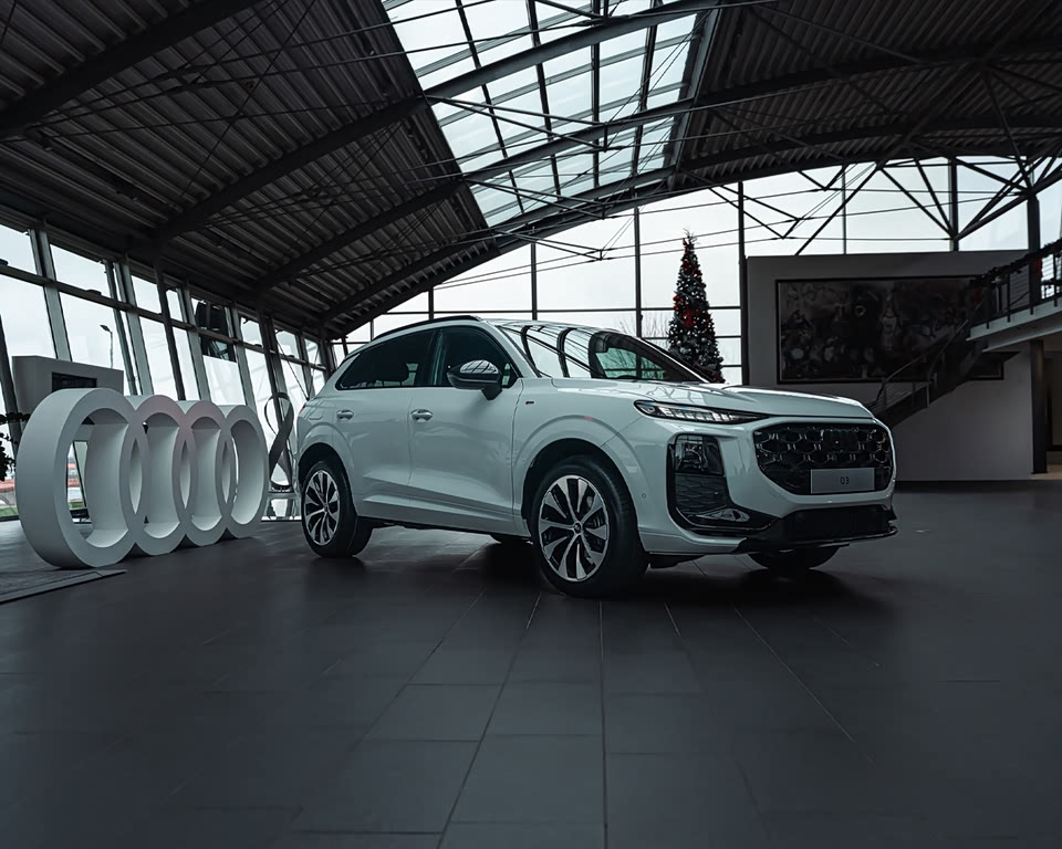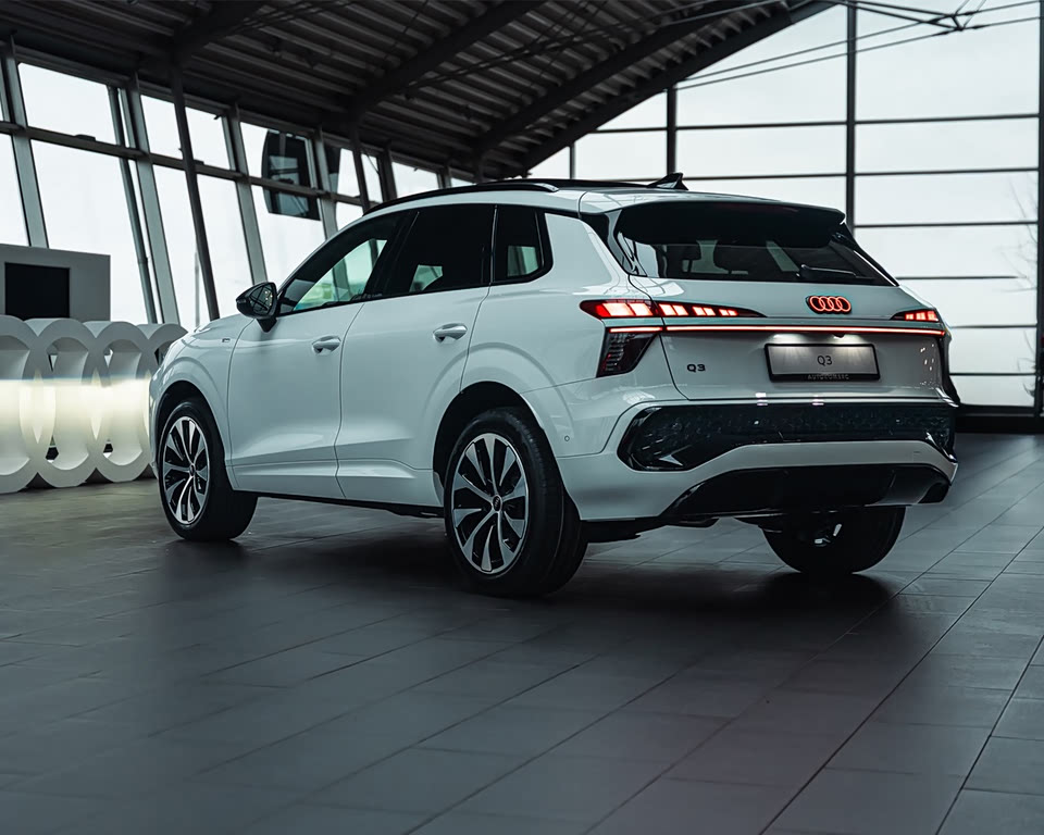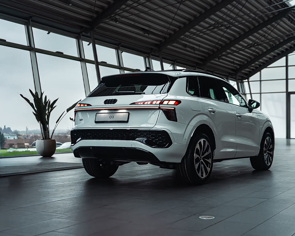 奥迪Q3海外版,实车采用了白色的大气车身造型,全新的设计显得很有气势,动力上搭载1.5T插混版本,配置有25.7kWh的电池包,WLTP工况纯电续航为120km,还采用了1.5T发动机匹配轻混系统。前脸的造型很有气势,采用了多边形的中网,内部带有网状的格栅造型,前包围采用了U型的格栅设计,感觉很有冲击力,配备数字矩阵LED大灯。侧面的设计比较大气,车身运用了硬朗的侧裙,侧窗线的风格也是很硬朗的造型,感觉很有气势。尾部提供贯通式的尾灯组,造型还是比较有辨识度,配置有OLED灯组。