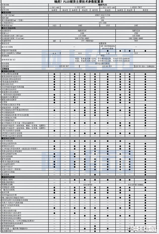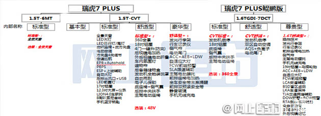 奇瑞此前发布了瑞虎7系列的全新车型—— 瑞虎7 PLUS版本,相较超能版整体变化不大,尺寸保持一致,内饰换用了与瑞虎8 PLUS相同的大连屏。网上车市从奇瑞汽车经销商处获得了瑞虎7 PLUS的详细信息。新车提供1.5T、1.5T+48V以及1.6T三种动力可选,从1.5T中配车型开始拥有LED灯组、双联屏以及4.0车联网系统等配置。售价层面,参考现款瑞虎7 1.5T手动挡8.39万起售,预计瑞虎7 PLUS会主打8.5万元-12万元市场,将在8月底上市。