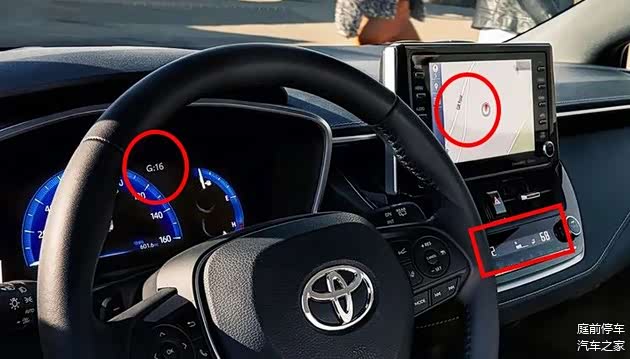 可以看到新车在仪表上拥有的“G16”字样,预告了新车将搭载与GR YARiS同款的G16E-GTS 1.6T三缸发动机,空调区域的“2 68”字样表明该发动机将是268马力的美规版本(欧洲和日本市场为257马力)。同时,图中显示屏中的道路名称为“GR Four”,代表了新车的四驱系统。