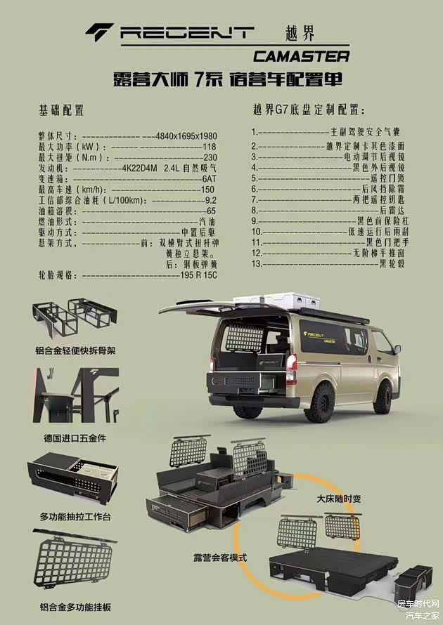 昨晚新吉奥与福田汽车合作,基于福田G7汽车底盘打造的复古越野房车——Camaster正式发布。这是国内首款由两家整车制造企业官方合作、联合打造的复古改装类越野露营房车,一直坚持走个性化路线的越界房车这一次算是引领了一波潮流。个性的外观和内饰设计,强劲的越野性能,再加上12.95万元的起售价,笔者愿意称之为年轻人的第一辆越野露营车!