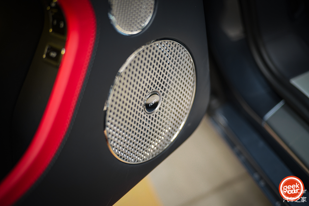金属拉丝的饰板和音响罩呈现出钻石或者中世纪骑士铠甲一般的规律条纹,庄严地守卫着中空扶手台这一块精心布置的空调座椅操控实体按键。