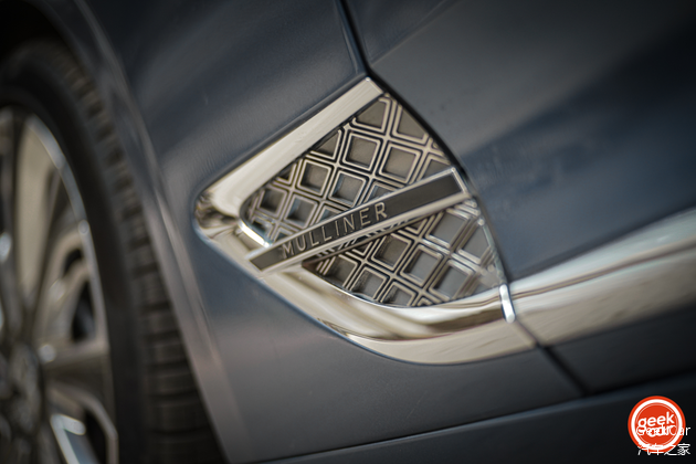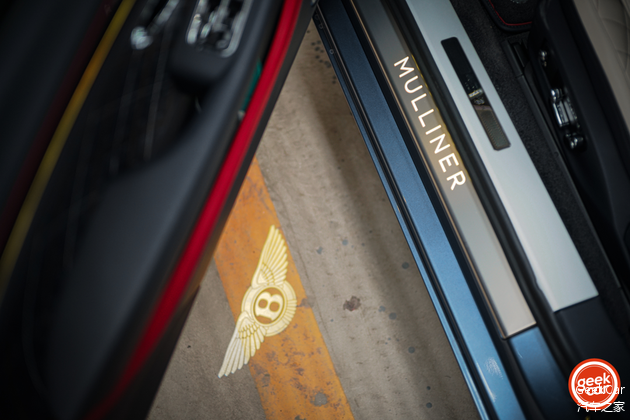 打开车门,仿佛登上游艇的门槛上也有两层「台阶」,内外泾渭分明,外面大的标牌写着 Mulliner 的字体端庄大气,而内层更为精致的小字写着「全车由位于英国克鲁郡的宾利汽车公司手工打造」。