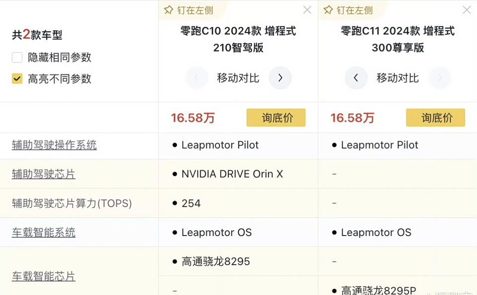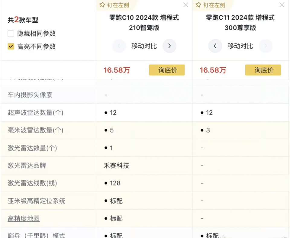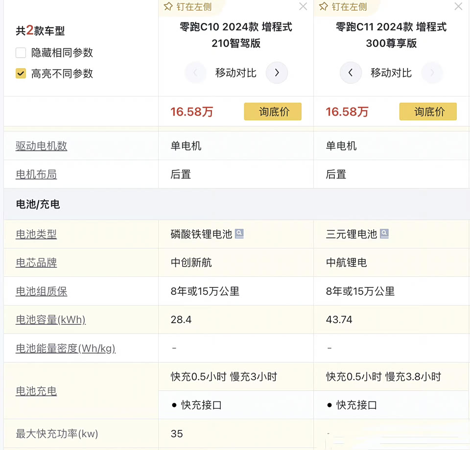 零跑 C10 和 零跑 C11,仔细研究了一下这俩车的区别 从尺寸空间来看,基本没什么变化,可以忽略不计。不一样的地方是 C11 的底盘配置更强,用料更好,比 C10 强。 续航方面,C11 增程版最高搭载 43 度电池,纯电续航 200KM+ 了,但是 C10 增程版才不到 30 度的电池。 C10 的强项是智能化,最高有 8295+Orin X,还有高阶智驾功能。除此之外,内饰设计、车机功能也是最新的。 所以说,十几万想买“移动的家”,还是得做出一些取舍的,不可能面面俱到。