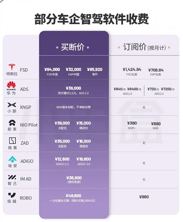 来看一下主流车辆智驾系统的软件收费。