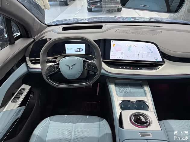 进入车内,不难发现天工08的内饰几乎复制了EH7的内饰。天工08的中控采用了异形双联屏的造型,液晶仪表盘和多媒体显示屏连为一体,15.6英寸的屏幕做了边框弧度处理。也许是因为屏幕做成斜边设计,看起来总觉得屏幕很小,看着很不舒服,完全没有主流新能源那种科技时尚感。